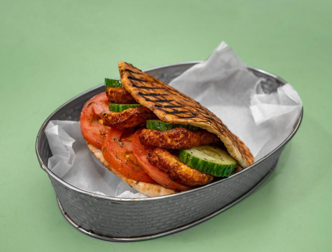 Vegan. Fried falafel on a pita pocket with lettuce, tomatoes and onions mixed with parsley and tahini sauce.