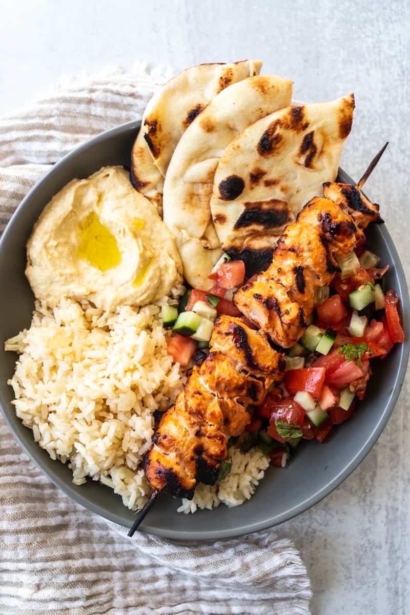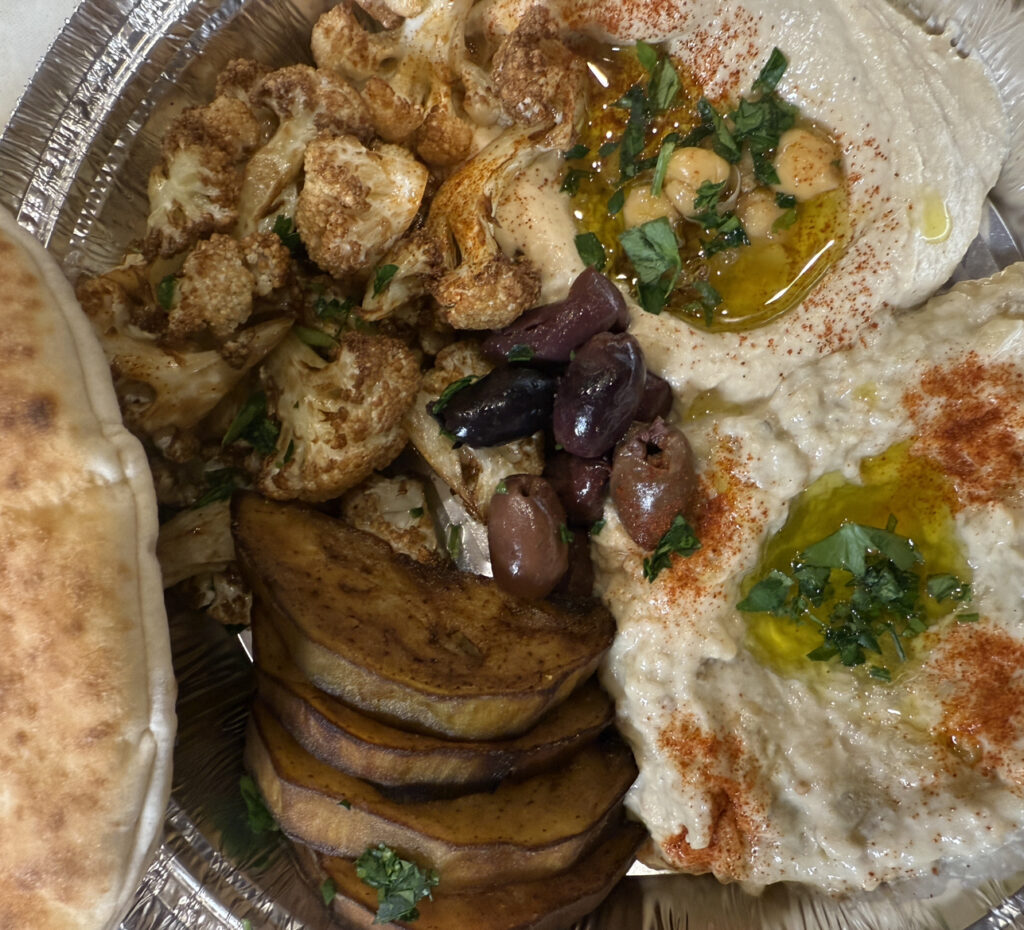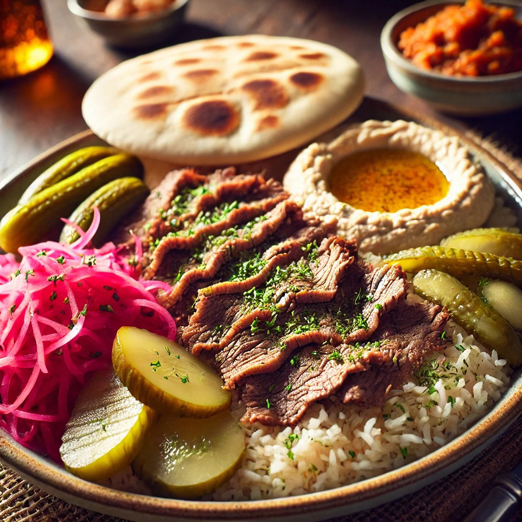 Chicken breast over Lebanese rice with turnips, pickles, hummus and pita pocket.