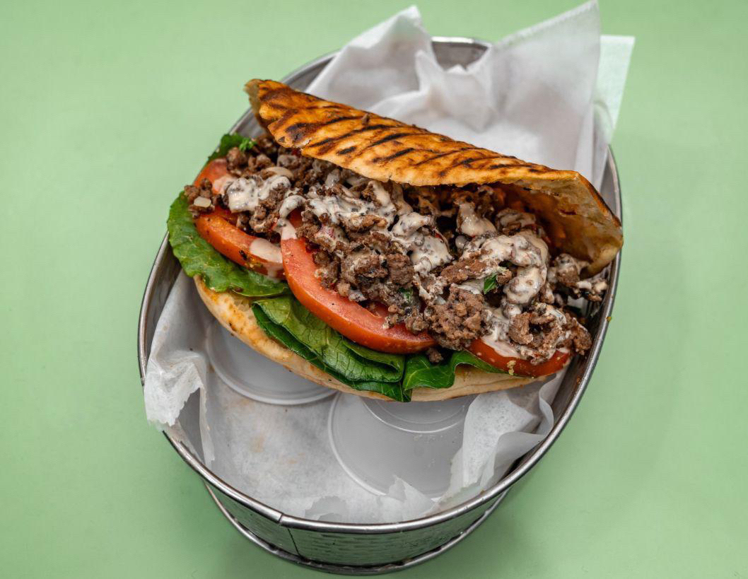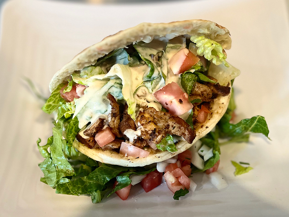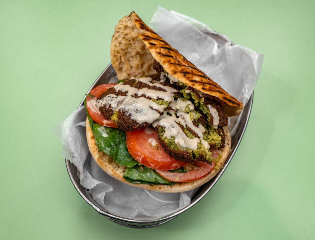 On a pita pocket with lettuce, tomato, onions, parsley, tahini and garlic sauce.